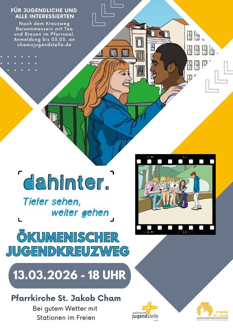 Wir möchten gerne zum Ökumenischen Jugendkreuzweg am Freitag, den 13.03.2026 um 18 Uhr nach Cham St. Jakob einladen. Das diesjährige Motto lautet "dahinter. Tiefer sehen, weiter gehen".